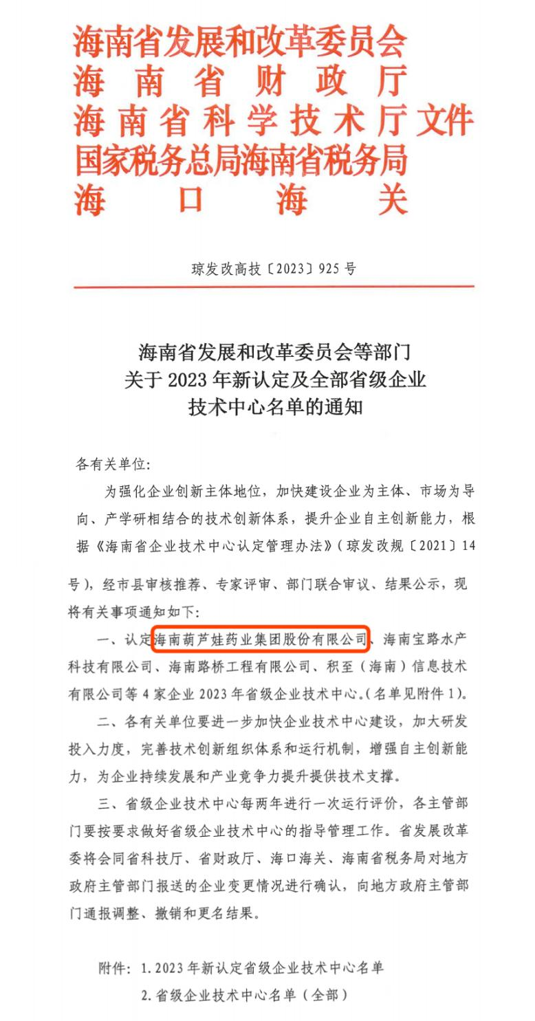 近日,海南省发改委等多部门联合公布了《关于2023年新认定及全部省级企业技术中心名单的通知》,其中,海南yp电子药业集团股份有限公司成功通过评审,被认定为省级企业技术中心,是本次获批的4家企业之一。